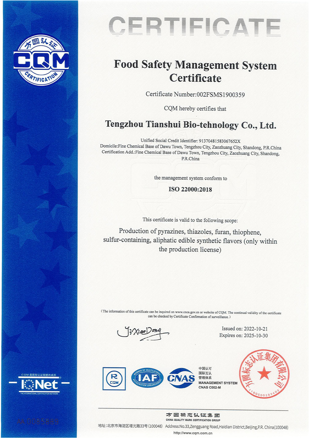 滕州市天水生物科技有限公司成立于2011年9月,是目前國內雜環類合成食品香料、日化香料和醫藥中間體生產經營的綜合性企業。坐落于山東省滕州市生物醫藥產業基地,總投資5000余萬元,占地面積約30000平方米,員工百余人。公司先后被評為高新技術企業、專精特新中小企業、科技型中小企業,建有市級重點實驗室1處,并先后獲得ISO9001質量體系認證、ISO22000食品安全體系認證、kosher認證和Halal認證。是香精香料及食品配料協會會員單位及滕州市中小企業協會理事單位。